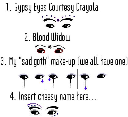 -Directions-1. Gypsy Eyes Courtesy Crayola: You'll need Crayola Gillter Glue A cheap little gem spirit glue, crazy glue, liquid latex, etc.(optional) pixie dust(optional) eyeliner, eye shadow, mascara, etc. a. Apply your eye liner, eye shadow, mascara, etc. however you want. b. Choose a color of Crayola Glitter Glue you like best. DON'T squeeze very hard, only a small amount of pressure is needed. Be VERY CAREFUL not to get it in your eyes. Dab little dots about your eyebrow. You can also squeeze some glue onto a paper plate and take a cuticle stick, tooth pick, small paint brush, etc. to dab the dots on. c. Rub a small amount of pixie dust were you plan on the putting the gem. d. Choose the gem want to use, you can either apply this to your face with spirit glue, crazy glue, liquid latex, eyelash glue, etc. or you can use a small dab of the glitter glue on the back of the gem. The glitter glue does not last as long as the other mentioned products, but it works for a few hours. 2. Blood Widow You'll need Black eyeliner(liquid or pencil) Red lip or eye liner(liquid or pencil) Manic Panic Glamour Eyes in Starry Night Eyelash adhesive small spider gem a.line your eyes with a thin layer of black liner, add a thicker layer just about that of red liner, add another small line of black again. b. apply Glamour Strip c. apply spider in desired spot. 3. My "sad goth" make-up You'll need Light colored eye shadow, black eyeliner small tear shaped gem adhesive mascara q tips water hair spray A frown a. apply the light colored shadow to the crease of your eye. b. apply a thick layer of black eyeliner(both over and under eye) c. apply mascara d. draw line down from center or eye, thicken, make gaps or bumps in line. e. take wet q tip and roll over bottom of eye eyeliner and the line from the bottom of your eye. Redraw, rewet, etc. f. dampen another q tip with hair spray and roll it over the design to ensure it sticks. g. apply gen wherever you please. 4. Untitled You'll need Crayola Gillter Glue eyeliner silver eye shadow a. apply silver eye shadow a little about the drease, tapered off at the out side of your eye. b. apply eyeliner, sort of in cat style makeup. c. under left eye dab three dots of crayola glitter glue, useing either a small brush, a toothpick, or gently squeezing the bottle. d. above your right brow dab three similar dots of glitter glue. e. above dots draw a line, about as long as your brow of glitter glue. Now go out and scare the hell out of a complete stranger! jagged_lil_loser | |||